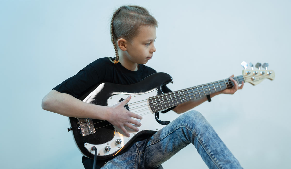 Punapaitainen tyttö soittaa sähkökitaraa polviasennossa